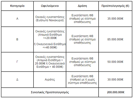 - αγρότες για την εγκατάσταση Φ/Β συστημάτων με ή χωρίς σύστημα αποθήκευσης για αυτοκατανάλωση με εφαρμογή ενεργειακού συμψηφισμού.