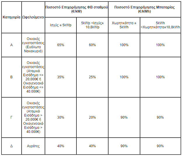 Πίνακας 1: Ποσοστά Επιχορήγησης ΦΒ σταθμού και μπαταρίας