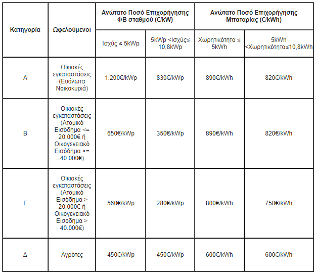 Πίνακας 2: Ανώτατα Ποσά Επιχορήγησης ΦΒ σταθμού και μπαταρίας