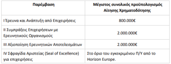 Κάθε αυτοτελής επιχείρηση (σε επίπεδο ΑΦΜ) μπορεί να συμμετέχει ως δυνητικός δικαιούχος σε έως πέντε (5) Αιτήσεις Χρηματοδότησης αθροιστικά στις Παρεμβάσεις Ι, ΙΙ και ΙΙΙ, καθόλη τη διάρκεια της Δράσης. Σημειώνεται ότι δεν τίθεται περιορισμός στον αριθμό των προτάσεων στις οποίες συμμετέχει ένας ερευνητικός οργανισμός.