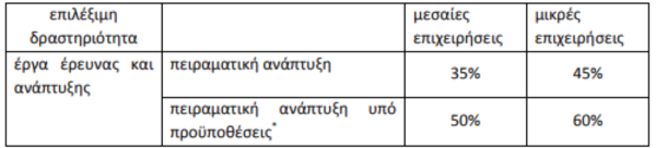 Αναλυτικά οι εντάσεις των ενισχύσεων αποτυπώνονται παρακάτω ανά κατηγορία παρέμβασης, ανά χαρακτηρισμό ενότητας εργασίας και ανάλογα με το μέγεθος της επιχείρησης.
