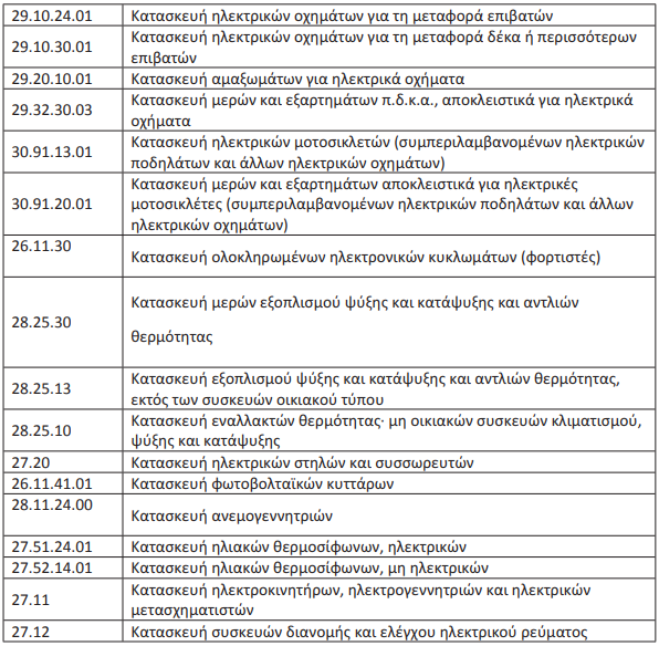 Σύμφωνα με το ΦΕΚ, 17 κατηγορίες ΚΑΔ εντάσσονται στο νέο πρόγραμμα, το οποίο έχει ως αντικείμενο δράσης την ενίσχυση επενδυτικών σχεδίων για την παραγωγή προϊόντων στον τομέα της πράσινης βιομηχανίας, με έμφαση στον παραγωγικό κλάδο της ηλεκτροκίνησης, των ανανεώσιμων πηγών ενέργειας καθώς και των προϊόντων και αγαθών, που προορίζονται για την εξοικονόμηση ενέργειας.