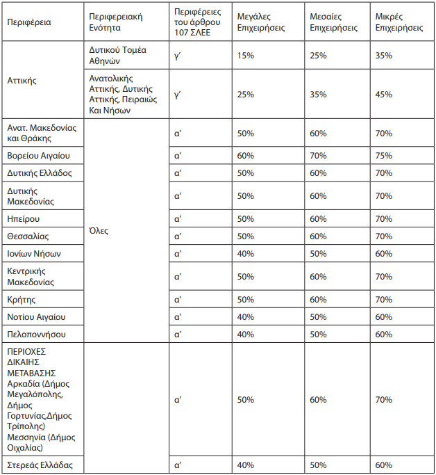 - Την αγορά της γης, την κατασκευή, την επέκταση και τον εκσυγχρονισμό κτιριακών εγκαταστάσεων, καθώς και ειδικών και βοηθητικών εγκαταστάσεων των κτιρίων, και για κατασκευές για τη διασφάλιση της προσβασιμότητας στα άτομα με αναπηρία και στα εμποδιζόμενα άτομα, καθώς και διαμόρφωση του περιβάλλοντος χώρου. Οι δαπάνες αυτές αθροιστικά δεν μπορούν να υπερβαίνουν το πενήντα πέντε τοις εκατό (55%) του συνόλου των ενισχυόμενων δαπανών περιφερειακού χαρακτήρα.